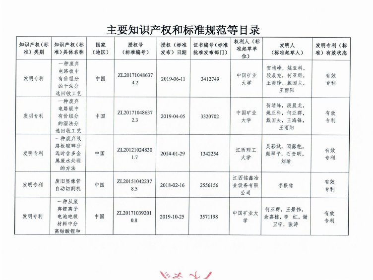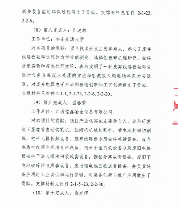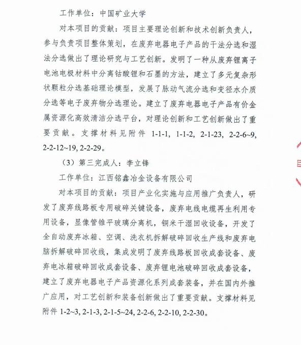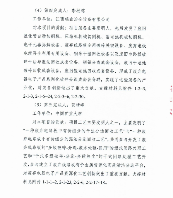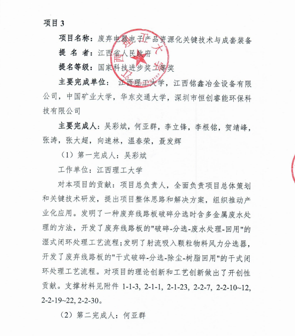 根據(jù)國家科學(xué)技術(shù)獎(jiǎng)勵(lì)工作辦公室《關(guān)于2020年度國家科學(xué)技術(shù)獎(jiǎng)提名工作的通知》要求,現(xiàn)將江西理工大學(xué)聯(lián)合江西銘鑫冶金設(shè)備有限公司、中國礦業(yè)大學(xué)、華東交通大學(xué)、深圳市恒創(chuàng)睿能環(huán)保科技有限公司合作完成、擬通過江西省人民政府提名的2020年度國家科技進(jìn)步獎(jiǎng)項(xiàng)目“廢棄電器電子產(chǎn)品資源化關(guān)鍵技術(shù)與成套裝備”予以公示。公示期為2020年1月1日至2020年1月7日。公示期內(nèi),如對(duì)公示項(xiàng)目內(nèi)容有異議,請(qǐng)以書面形式向項(xiàng)目公示單位提出,并提供必要的證明材料。以單位名義提出異議的,應(yīng)當(dāng)加蓋本單位公章;個(gè)人提出異議的,應(yīng)當(dāng)簽署真實(shí)姓名及聯(lián)系方式。