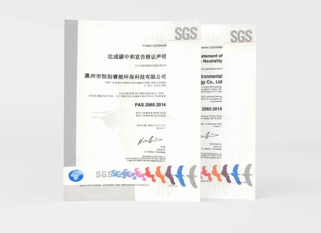 2023年9月,全球知名認(rèn)證機(jī)構(gòu)通標(biāo)標(biāo)準(zhǔn)技術(shù)服務(wù)有限公司(以下簡(jiǎn)稱“SGS”)為深圳市恒創(chuàng)睿能環(huán)保科技有限公司(以下簡(jiǎn)稱“公司”)旗下全資子公司惠州市恒創(chuàng)睿能環(huán)保科技有限公司(以下簡(jiǎn)稱“惠州恒創(chuàng)”)頒發(fā)PAS2060碳中和認(rèn)證證書, 這標(biāo)志著惠州恒創(chuàng)在2022年達(dá)成工廠運(yùn)營(yíng)碳中和,正式躋身零碳工廠行列,成為公司首個(gè)電池回收處置的零碳工廠,意味著公司在“雙碳”道路邁上了新的臺(tái)階。